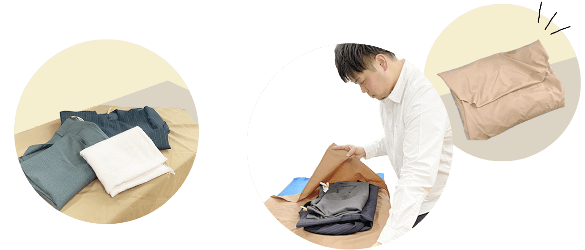 クリーニングやましたではお預かりしたお洋服を検品後、1人分ずつ風呂敷で包んでいます。こうすることでお洋服の紛失を防ぎ、お客さま単位の細かいご要望にも対応ができるようになりました。