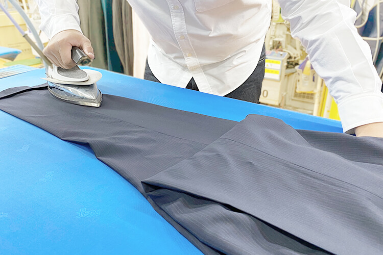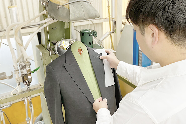 有名アパレルメーカーも使用しているドイツ製の仕上げ機を使用しています。立体的で美しいシルエットを復元し、生地本来の風合いを大切にした仕上げとなります。